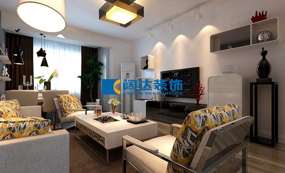 客餐廳:整體色調(diào)以簡(jiǎn)單的純白色為基調(diào),沙發(fā)背景墻配以現(xiàn)代感強(qiáng)勁的灰色,增強(qiáng)立體感。陽(yáng)臺(tái)區(qū)域打通,餐桌放置在采光好的原陽(yáng)臺(tái),利用原梁放置餐廳燈,配以強(qiáng)化復(fù)合多色拼接地板,輔助光源射燈和點(diǎn)綴色軟裝黃色抱枕起到畫(huà)龍點(diǎn)睛的作用,整體顏色過(guò)渡流暢,對(duì)比恰當(dāng)。