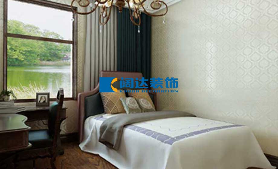 次臥室:次臥室為男孩房,墻面采用藍(lán)色豎條壁紙顯得活潑可愛(ài)。