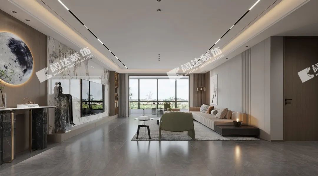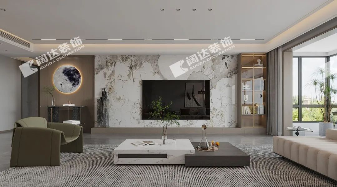 本案通過(guò)巖板、墻板、定制電視柜、定制酒柜的設(shè)計(jì),頂面采用無(wú)主燈線性軌道燈設(shè)計(jì),墻頂?shù)囟嗑S空間,雖然簡(jiǎn)潔,但收納功能強(qiáng)大,且最大程度減少后期打掃衛(wèi)生的繁瑣性。多種材質(zhì)和諧地融為一體,滿足了不同年代人們共同的審美需求??臻g開(kāi)闊、舒適,呈現(xiàn)質(zhì)感的雅奢風(fēng)范。