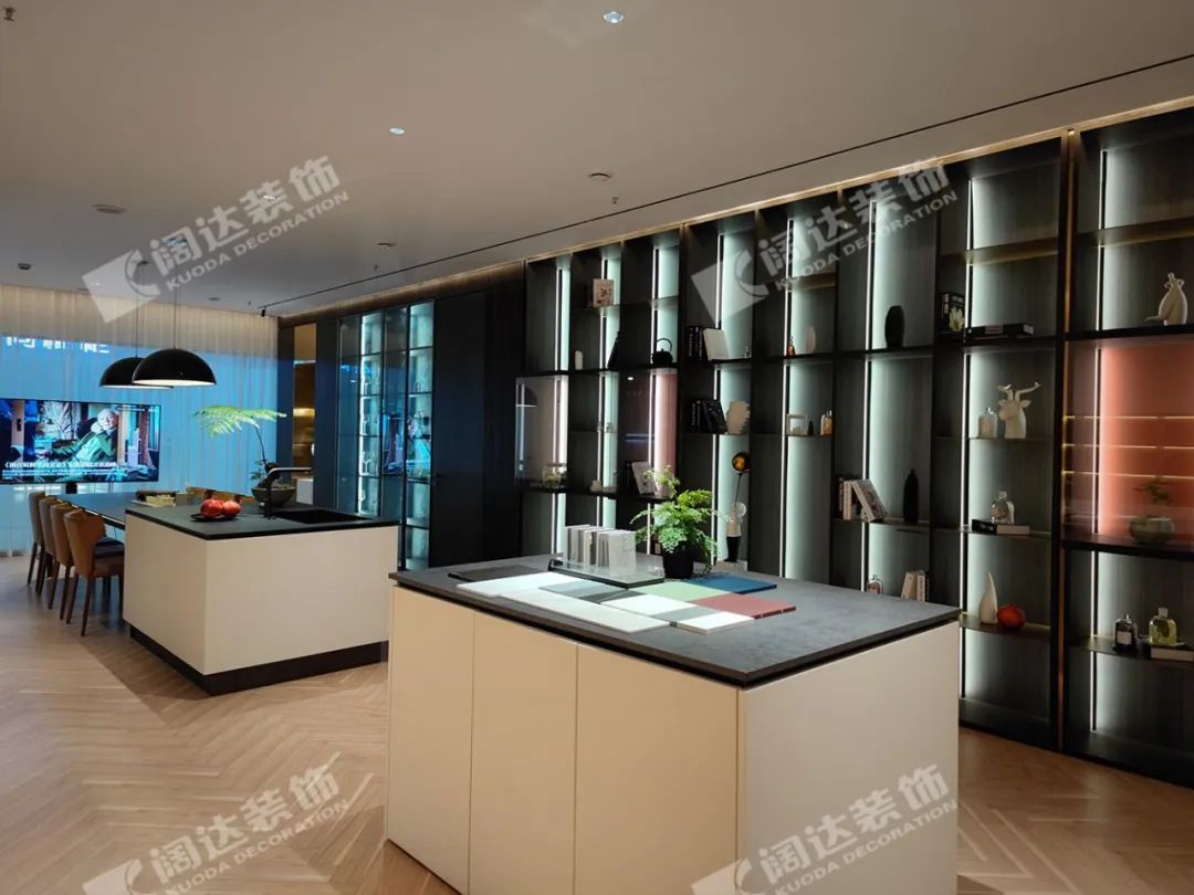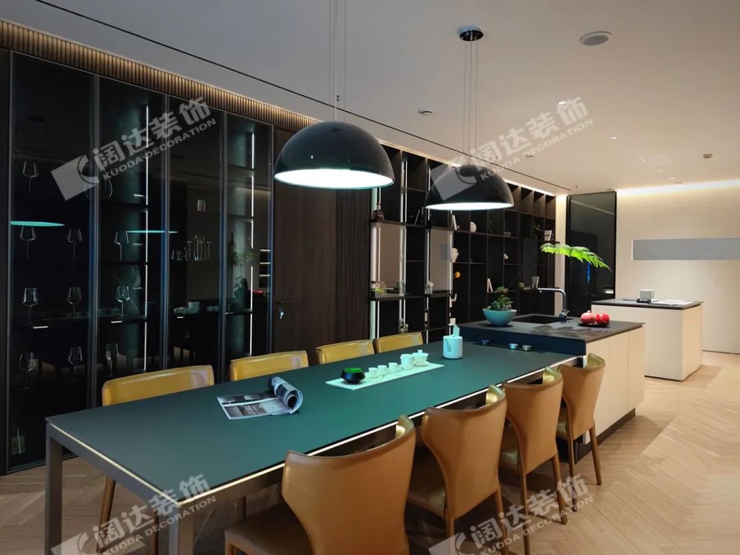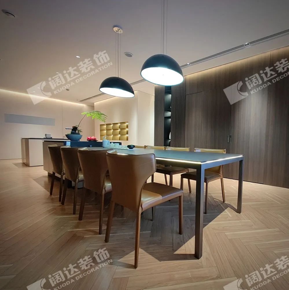 社交洽談區(qū)域采用當(dāng)代最流行的膚感飾面制作一體化島臺桌面,既提升品質(zhì),又有觸碰島臺桌面時的舒適感,在餐桌的前后分別有大面積的玻璃酒柜和可封閉式西廚操作臺,桌面邊上采用軌道插座,實用的設(shè)計,滿足了用餐和辦公的雙重需求。