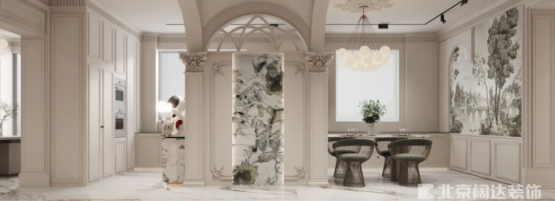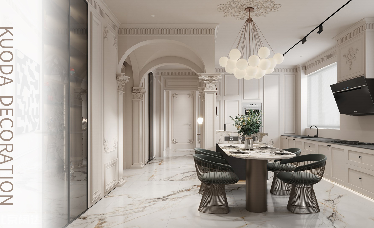 人間浪漫不過日出東方。把日出定格家中,一餐一食,皆溫柔。延續(xù)客廳的浪漫基調(diào),復(fù)古的壁畫為餐廳融入美好氛圍感;絲絨與羊羔絨餐椅將法式的優(yōu)雅完美表達。在功能上,增加島臺與餐邊柜,安裝小水槽和直飲機,縮短生活動線,提升家居舒適度。