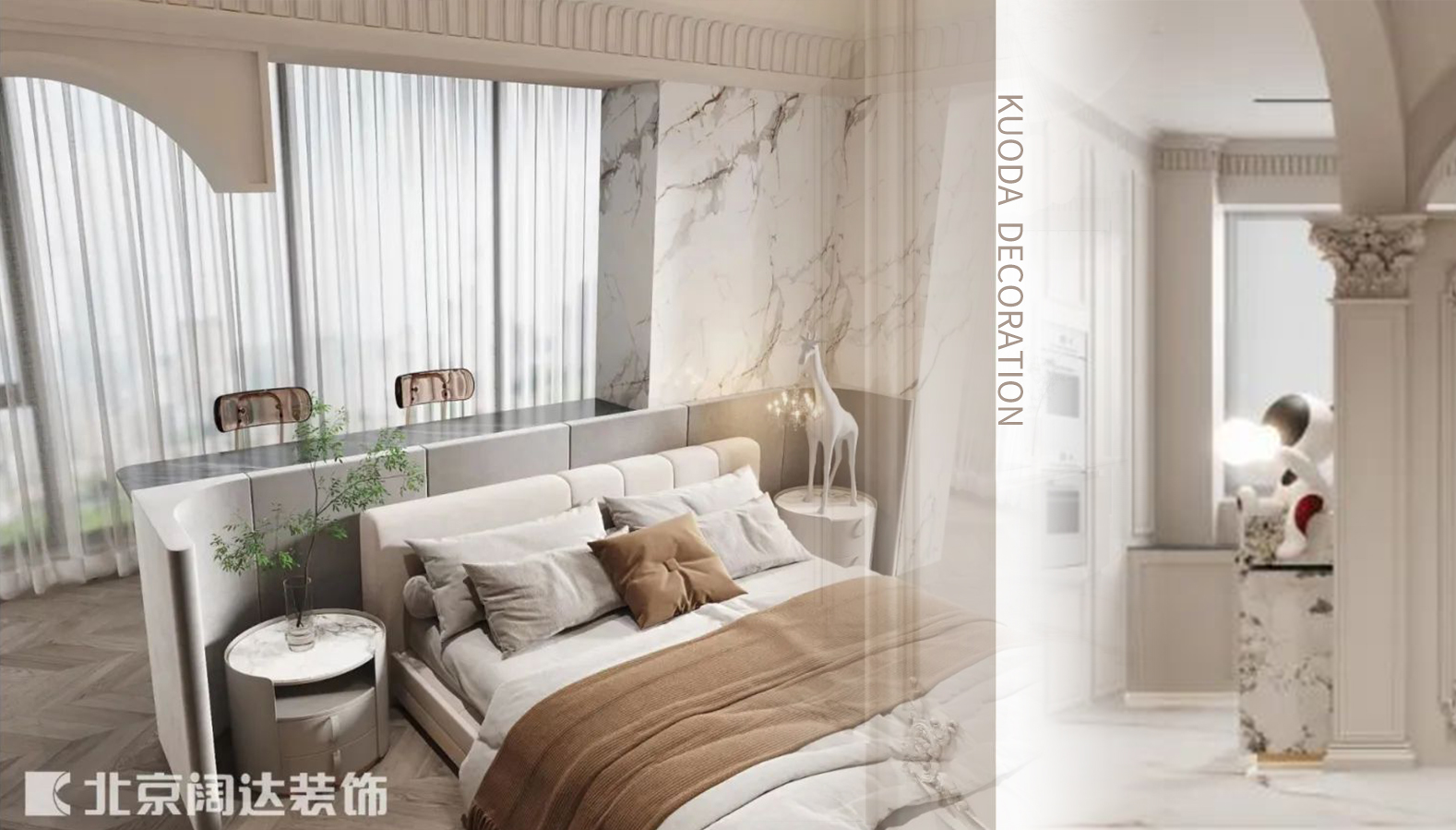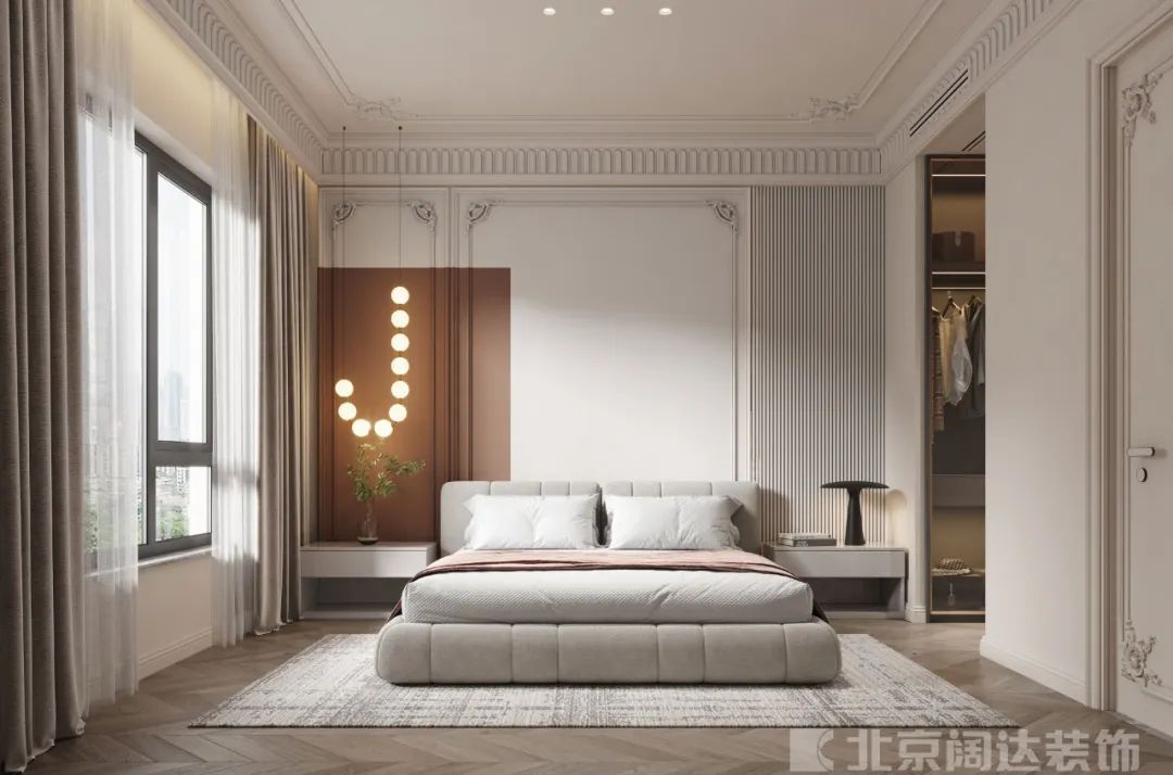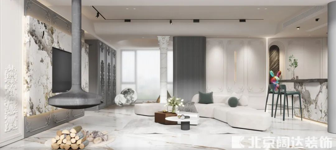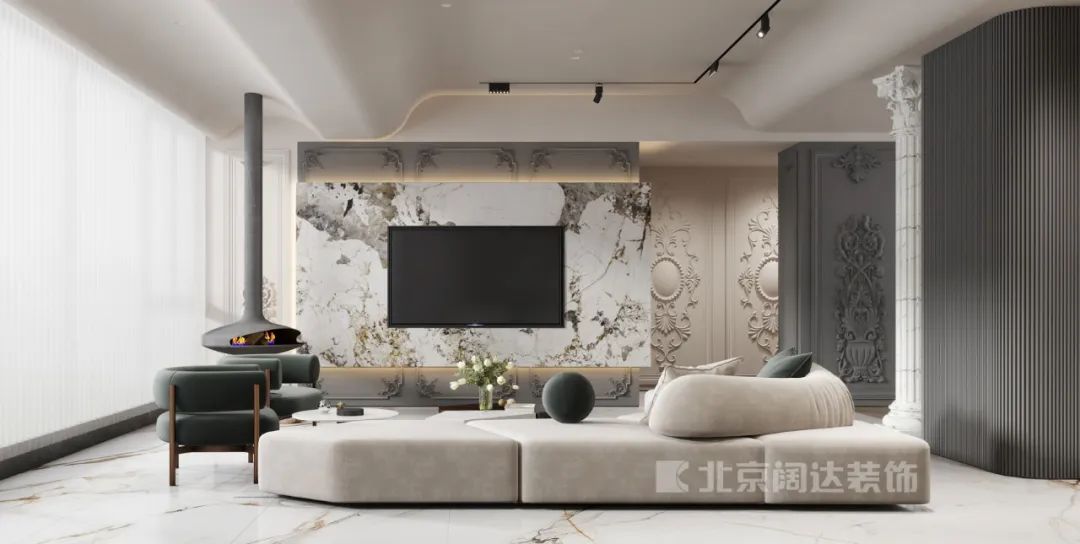 嵌入式設(shè)計的電視背景墻,結(jié)合巖板和法式線條護墻板,懸掛壁爐浪漫又不失質(zhì)感,既保留了法式的柔和,也融入了現(xiàn)代的大氣。圓弧形的吊頂上,嵌入式無主燈散落在“星盤”里,給予生活最自然浪漫的光影支持。