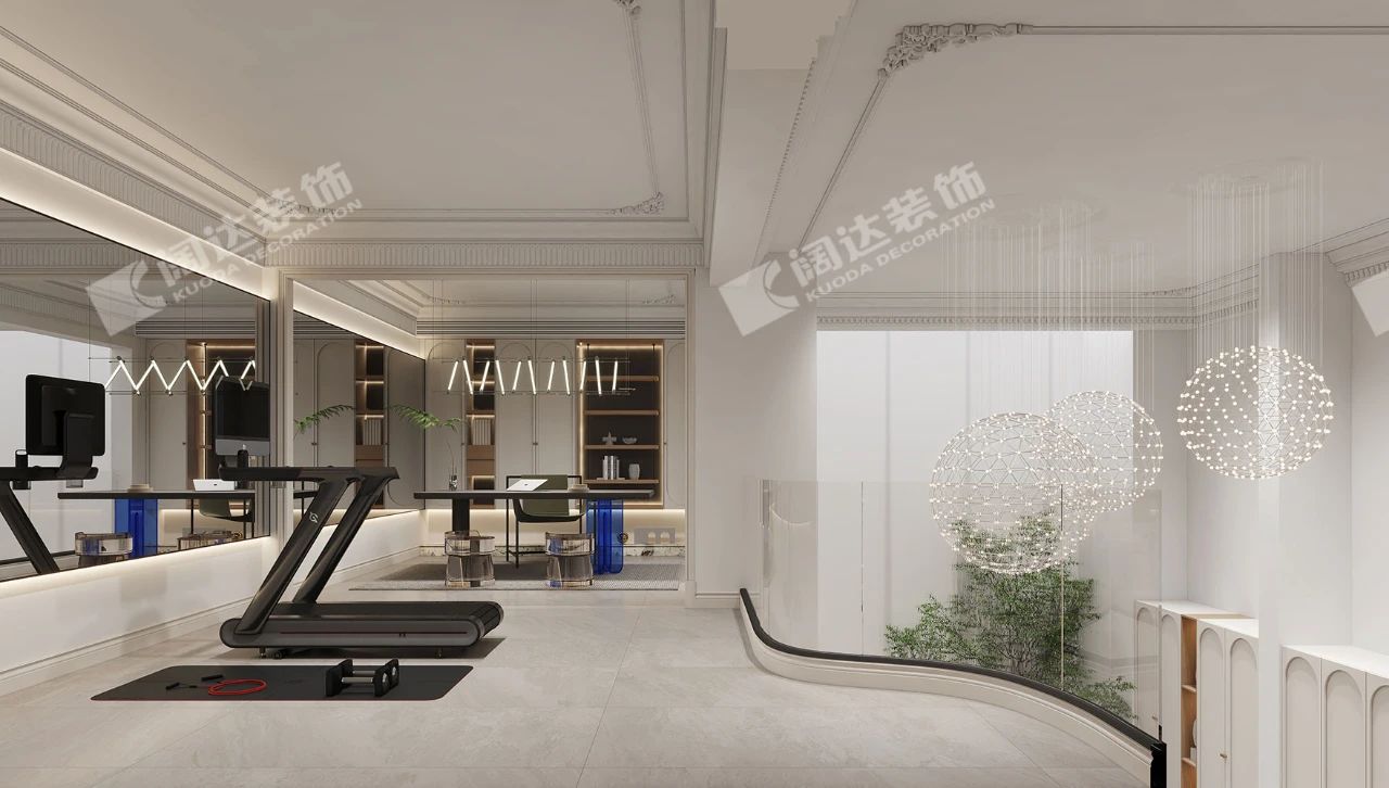 隔層區(qū)域是健身區(qū)和主人書(shū)房區(qū)域,為了在視覺(jué)上放大空間,將健身區(qū)的鏡子延伸穿插到書(shū)房里面,用氛圍燈進(jìn)行鏈接,看似單獨(dú)的兩個(gè)空間,卻又有著緊密的聯(lián)系。