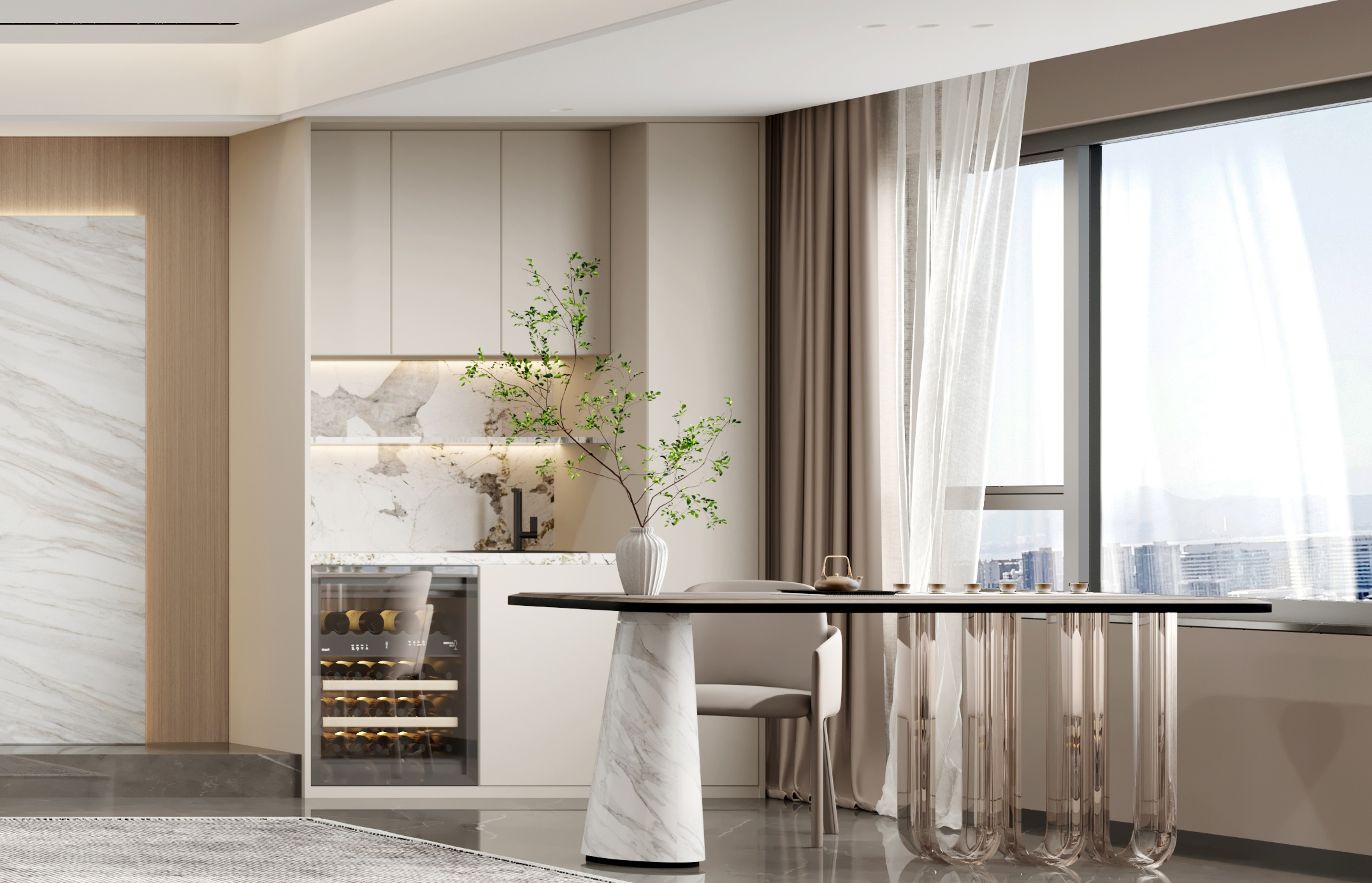 著重用空間處理的設(shè)計(jì)手法,來強(qiáng)調(diào)空間的靈活分割,以追求設(shè)計(jì)的幾何性和秩序感,空間線條簡約、流暢。