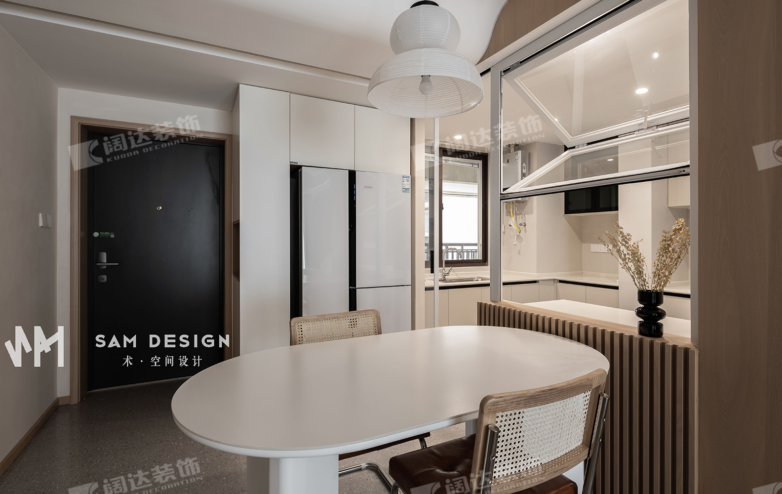 為了增大視覺(jué)以及活動(dòng)空間,將餐廳的視角與西廚連為一體,中島式的設(shè)計(jì)在餐廳增加了社交趣味的同時(shí),還增加了餐廳的儲(chǔ)物收納。
