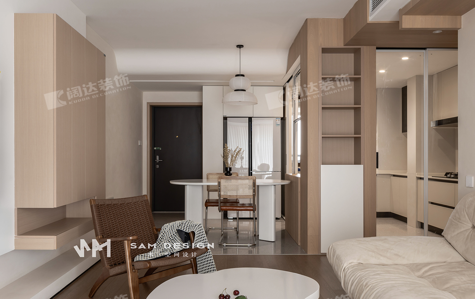 拆除了門廳左側(cè)墻壁,使得客廳、餐廳、廚房融為一體,很好地提升了空間感,入門后有寬敞的視野,不會(huì)被局限。
