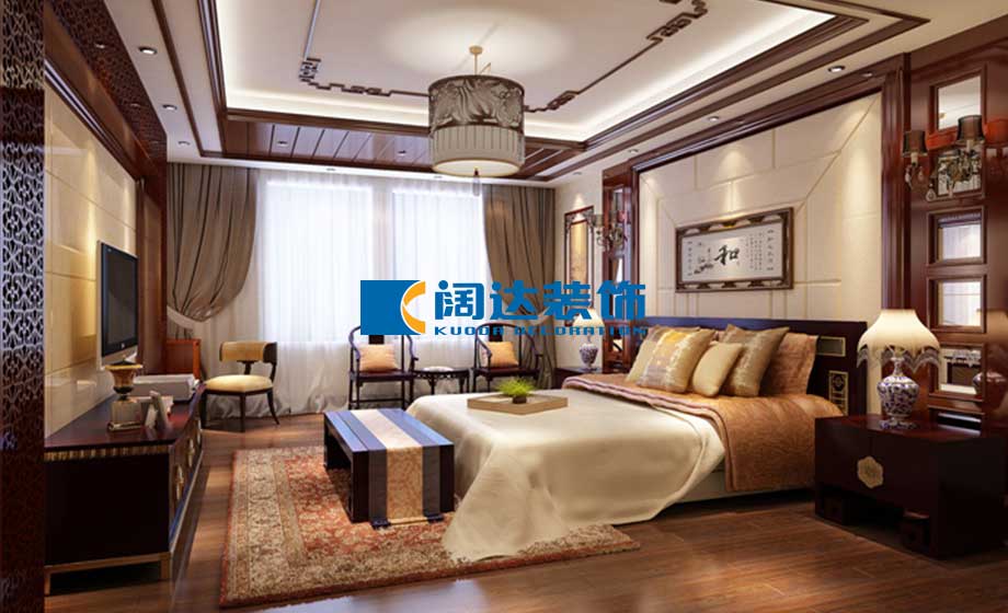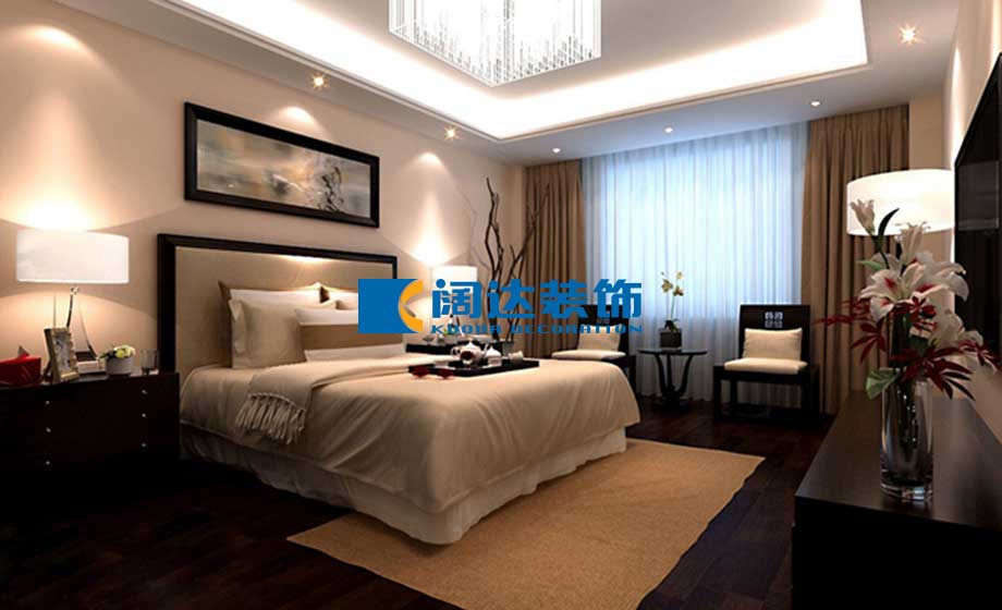 主臥室:本案的主臥室傳承了新中式的風(fēng)格,中式的吊頂和造型床頭背景使的臥室空間充實(shí)著中國文化氛圍。