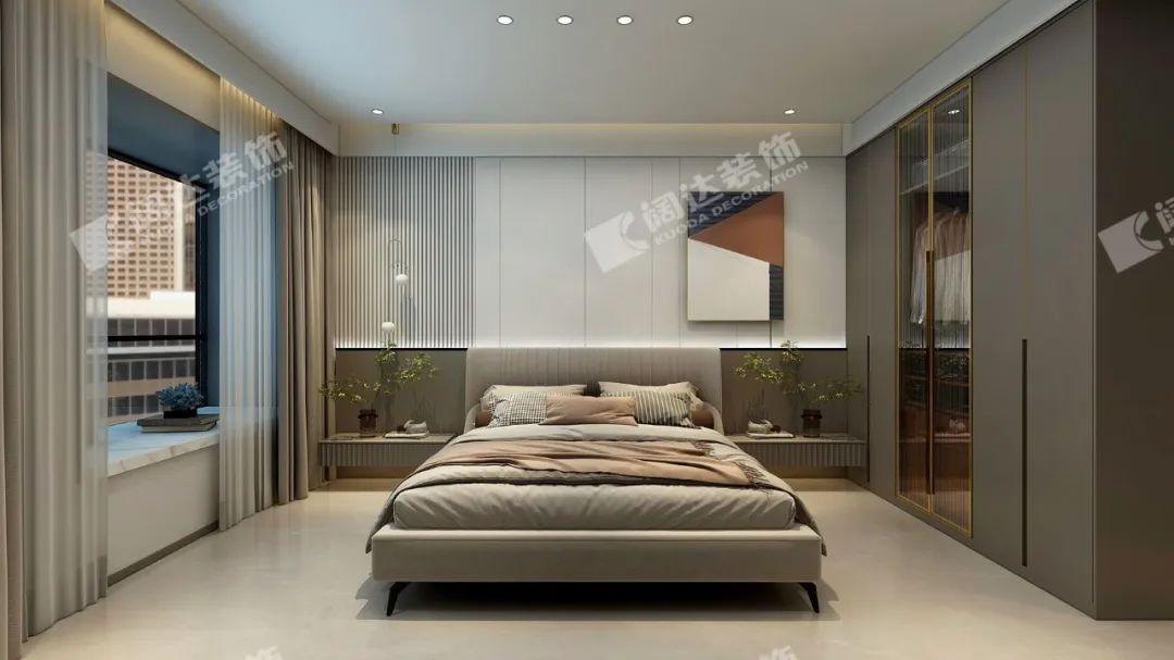 在整個空間中,不論是客廳、書房還是臥室都用了木色格柵鋪墊;一門到頂?shù)墓耋w、木門等看似簡潔的造型和搭配,延展出優(yōu)雅的調(diào)性,讓居住者輕易感受到生活的真趣。