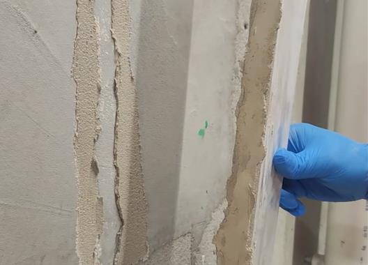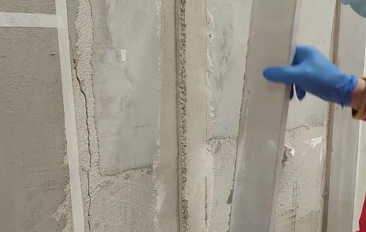 我們先將需要沖筋的位置薄批一遍,然后在將材料上到靠尺上,在將兩邊多余的材料用抹刀收平,我們?cè)趯⒔顥l取掉,可以看到筋條與基層粘結(jié)非常牢固,所以在沖筋找平前,需要對(duì)筋條位置先薄批一遍材料。