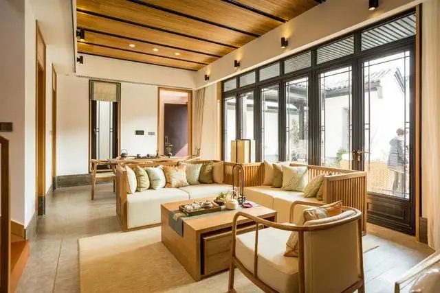 會(huì)客廳運(yùn)用木質(zhì)和淺色棉麻材質(zhì)結(jié)合,家具可以選用充滿中式古韻設(shè)計(jì)的沙發(fā)、桌椅、茶幾,帶著濃厚的東方清雅格調(diào),體現(xiàn)著人與自然和諧相處的態(tài)度。