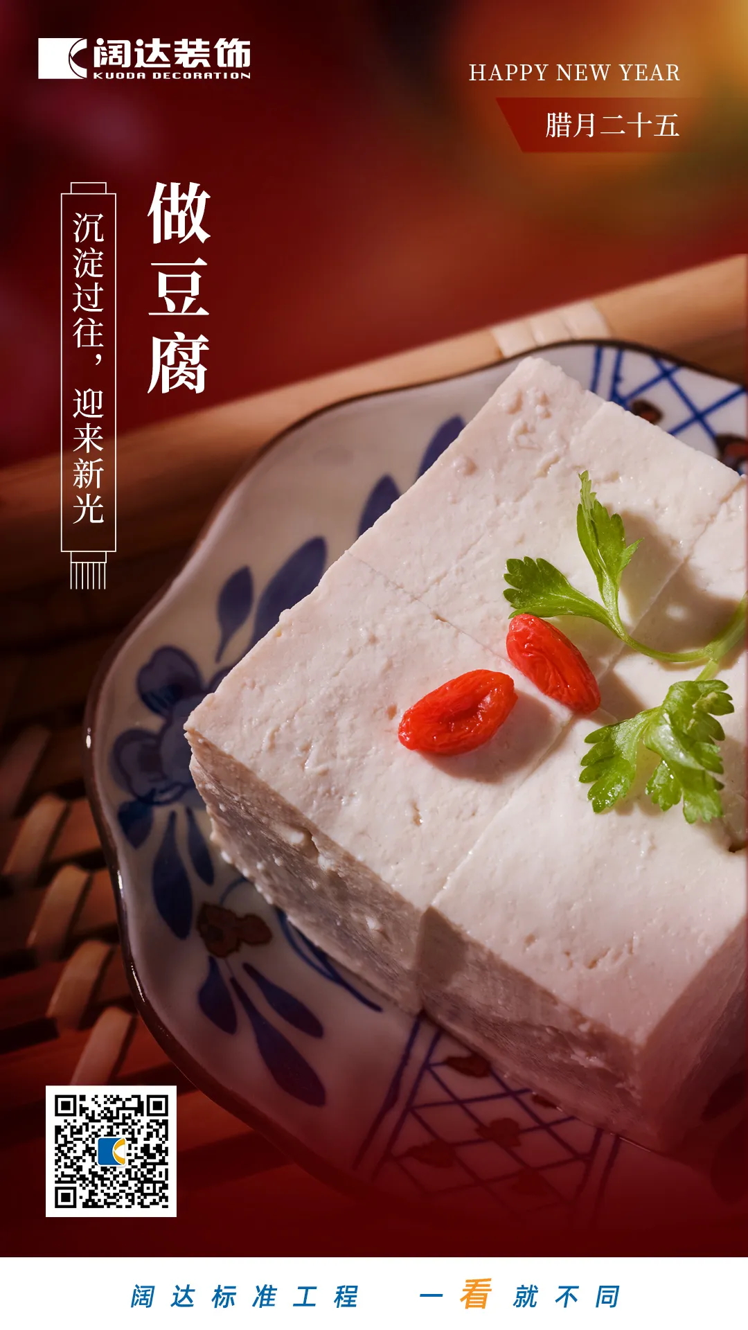 民諺稱:臘月二十五,推磨做豆腐。民俗學家表示,豆腐的“腐”和富裕的“富”諧音,二十五磨了豆腐,祈愿來年的生活能過得富富余余?!岸垢甭犉饋硐瘛岸几弧?,寄予了人們新年要富貴的心愿。