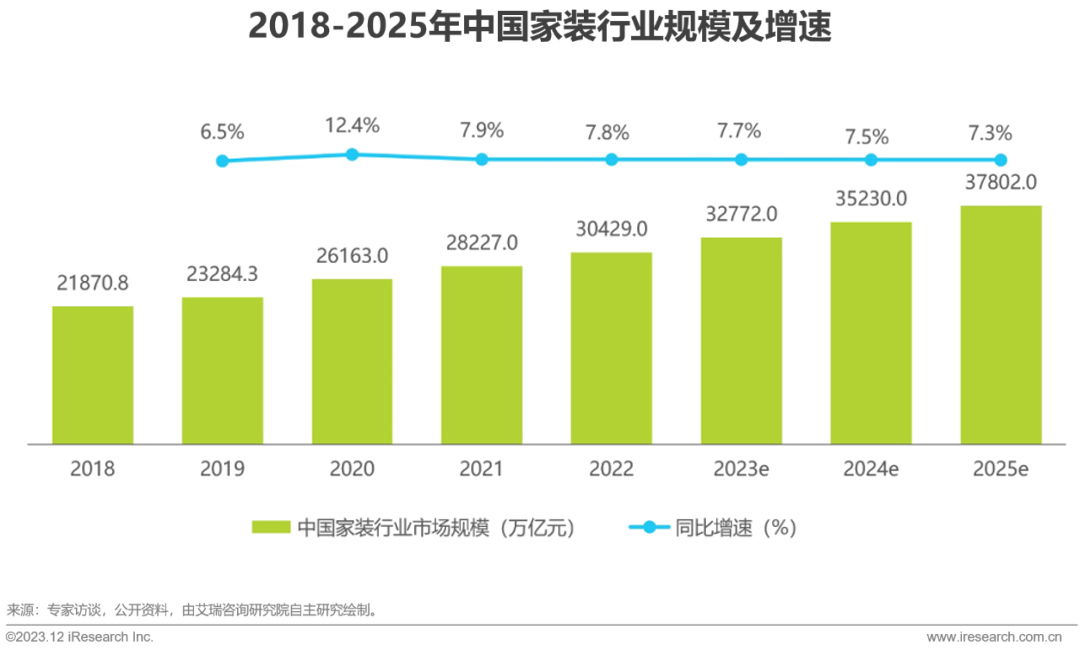 《2023年中國(guó)家裝行業(yè)研究報(bào)告》顯示,家裝行業(yè)增長(zhǎng)動(dòng)力充足,市場(chǎng)規(guī)模將達(dá)到37802億元。