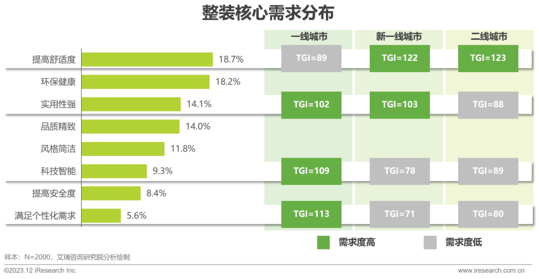 二、用戶需求:消費(fèi)者選擇整裝公司的出發(fā)點(diǎn)高度集中于專業(yè)和便利,認(rèn)為選擇整裝服務(wù)能夠提高房屋的裝修效率。在設(shè)計(jì)方案決策環(huán)節(jié),比起滿足個(gè)性化定制,更多的消費(fèi)者希望整裝公司提供兼具數(shù)量與多樣性的設(shè)計(jì)方案,結(jié)合公司以往案例進(jìn)行挑選,由專業(yè)設(shè)計(jì)團(tuán)隊(duì)引導(dǎo)、挖掘房屋設(shè)計(jì)需求。而舒適度和環(huán)保健康則是消費(fèi)者兩個(gè)最核心的需求,一線城市居民更追求智能化和個(gè)性化,二線城市居民更追求舒適度。