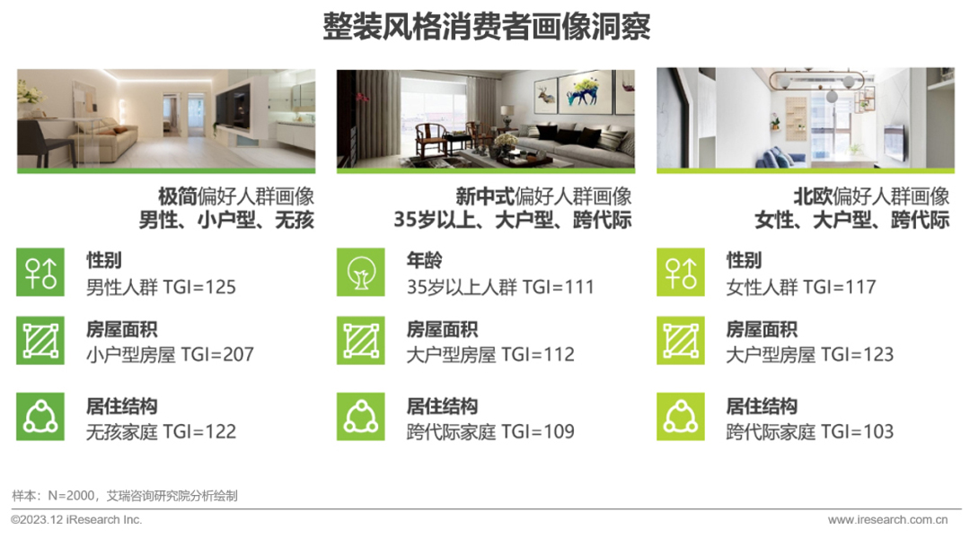 三、整裝新模式:基于傳統(tǒng)模式用戶需要花費(fèi)大量時(shí)間與精力去與各方接洽溝通、流程冗長(zhǎng)、參與者眾多、用戶體驗(yàn)普遍較差的痛點(diǎn),整裝托管服務(wù)模式應(yīng)運(yùn)而生,由管家提供一站式服務(wù),對(duì)接工人與建材,憑借專業(yè)知識(shí)為用戶把控施工品質(zhì)與交付節(jié)奏,家裝用戶僅需與管家溝通,省時(shí)省心。四、整裝風(fēng)格喜好:極簡(jiǎn)和新中式最受中國(guó)家庭歡迎,無(wú)孩家庭更重視簡(jiǎn)單實(shí)用,青睞極簡(jiǎn)風(fēng);跨代際家庭更重視環(huán)保舒適,偏愛(ài)新中式與北歐風(fēng);而復(fù)古與日式則成為小眾精致之選。
