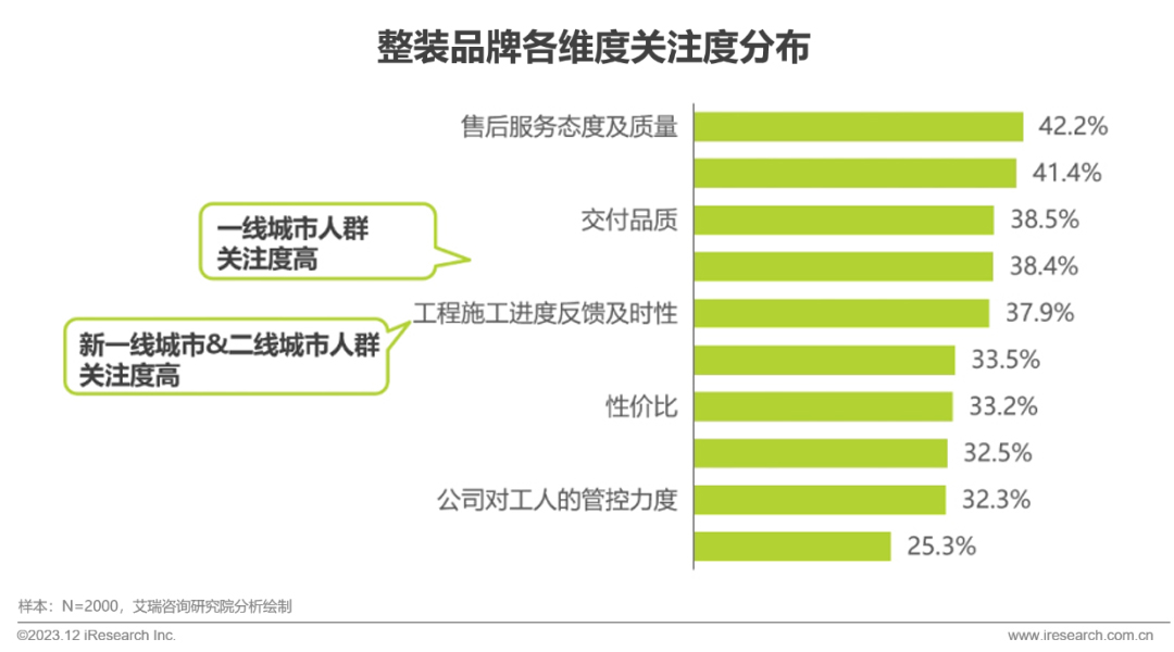 六、品牌關(guān)注因素:消費(fèi)者對(duì)品質(zhì)與售后服務(wù)的關(guān)注度超越性價(jià)比和工期,裝修風(fēng)向“從有到好”特征凸顯。消費(fèi)者對(duì)各品牌的裝修風(fēng)格、材料選擇、施工隊(duì)伍等各個(gè)方面均進(jìn)行深入研究和理性權(quán)衡。其中,整裝公司的售后服務(wù)和耗材品質(zhì)是消費(fèi)者的重點(diǎn)考察對(duì)象,體現(xiàn)出消費(fèi)者格外重視房屋裝修的耐久性;其次重要的為交付品質(zhì)、公司知名度與口碑和反饋的及時(shí)性。