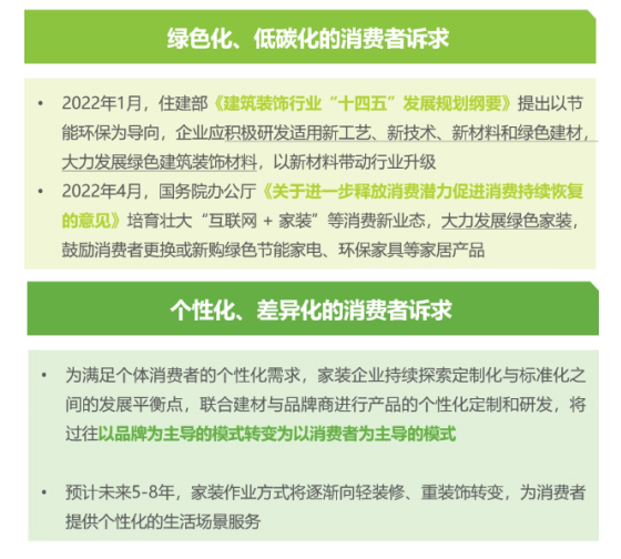 在經(jīng)濟(jì)增長(zhǎng)、居民收入水平提升以及家裝消費(fèi)群體年輕化等趨勢(shì)下,越來(lái)越多的消費(fèi)者開(kāi)始接受“居家升級(jí)”的消費(fèi)理念。隨著消費(fèi)者對(duì)家裝家居品質(zhì)的要求提升,綠色化、智能化家居體驗(yàn)成為消費(fèi)者家裝家居的需求新方向,家裝企業(yè)通過(guò)材料創(chuàng)新,在推動(dòng)產(chǎn)品升級(jí)的同時(shí)創(chuàng)造新需求,新材料的研發(fā)與應(yīng)用在家裝行業(yè)前景廣闊。此外,在家裝企業(yè)標(biāo)準(zhǔn)化發(fā)展和消費(fèi)者個(gè)性化需求之間找到平衡點(diǎn),成為行業(yè)發(fā)展的新風(fēng)口。