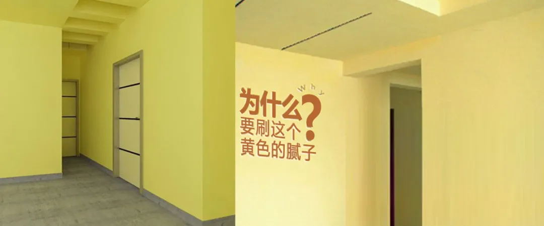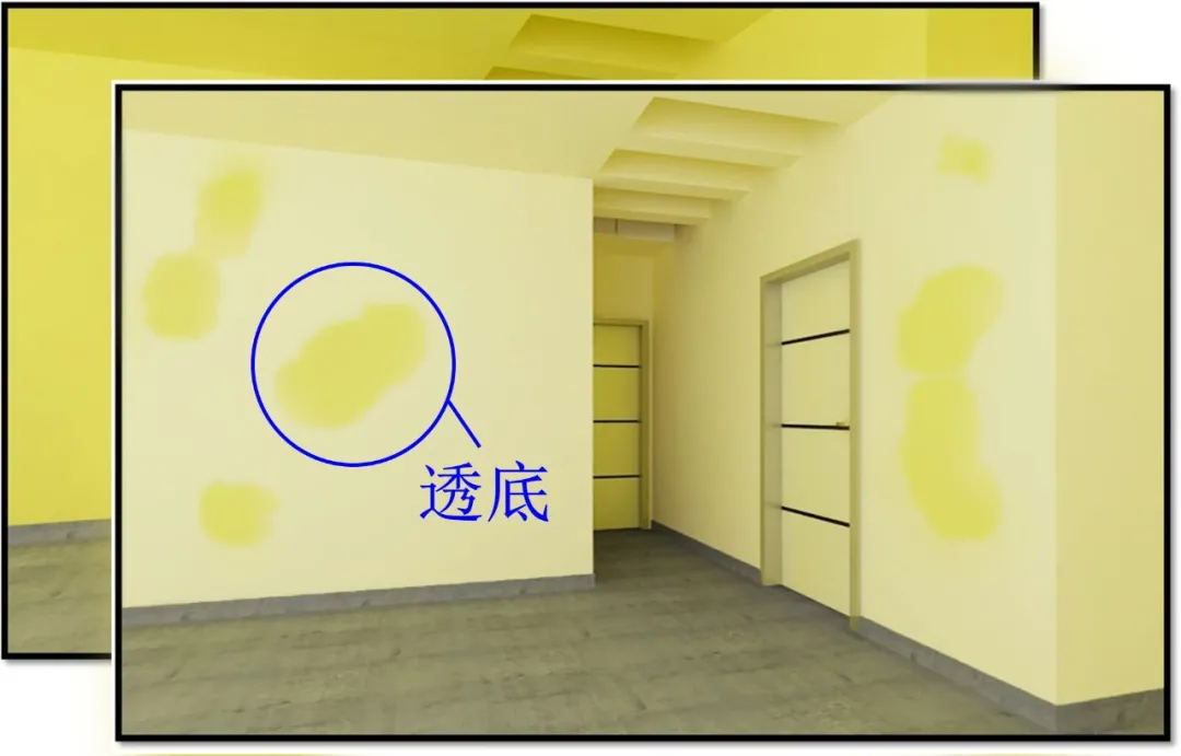 傳統(tǒng)的白色膩子是無法實現(xiàn)對乳膠漆涂刷遍數(shù)和涂刷濃度的自檢功能的。而闊達專利技術(shù)之一,黃色墻襯恰恰能實現(xiàn)這一功能。因為如果乳膠漆兌水比例超出標(biāo)準(zhǔn)范圍,在乳膠漆涂刷過程中,油工無論涂刷多少遍,這個黃色的墻襯也是遮蓋不住的,乳膠漆干燥后墻面是花的,一團一團的不規(guī)則的黃色,也就是俗稱的“透底”(見上圖示例)。